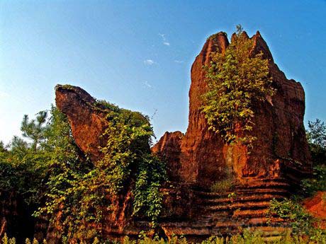 紅石林位于茄通和斷龍山鄉(xiāng)境內(nèi),方圓上萬公頃,精華景觀達數(shù)百公頃。那遍布的紅彩奇石造型各異,姿態(tài)萬千,或依山而立,或拔地而起,古樸秀雅,氣勢宏偉,身臨其境,恍如仙境。一尊高 12.6米的擎天石柱,猶如一東方巨人,指點江山;巨石對面,另一石則婀娜多姿,秀麗動人。另有一山頭遍布紅石,或高或低,或長或短,游人入此,頓覺撲朔迷離,難覓來路。入另一處石林,但見如墻似垣,高度不大,但排列組合得與樓蘭古城布局相差無幾。這里所有的石頭都披著一層細密的皺褶,如珊瑚礁一般,讓人想起幾萬年前這里是一片浩闊的大海,海浪時時轟鳴著一波波沖擊著礁石。