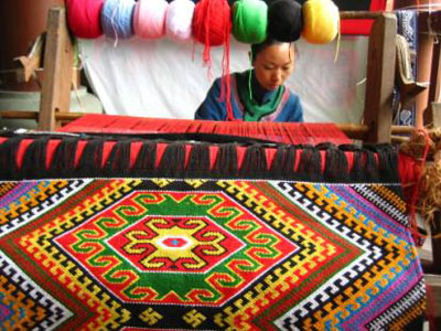 土家織錦是土家婦女用一種古老的木腰機(jī),以棉紗為經(jīng),對(duì)五彩絲線或棉線(當(dāng)今也有用毛線的) 為緯,完全用手工織成的手工藝術(shù)品。