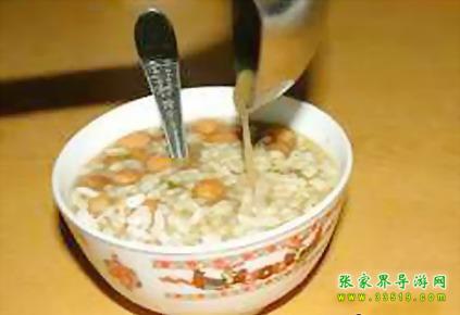 油茶湯對土家族人來說一日三餐少不了。土家油茶湯是張家界土家族具有代表性的包含文化現(xiàn)象之一,土家語稱“色斯?jié)缮?rdquo;,堪稱中國茶文化一絕,源遠流長。據(jù)清代的古書記載:“土人以油炸黃豆,包谷,米花,綠焦諸物,取水和油,煮茶葉和湯泡之,餉客致敬,名曰:‘油茶’”。