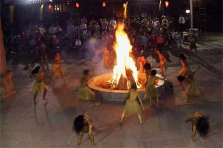 “擺手”,土家人稱為“社巴”,正月初三至十七日這段時(shí)間稱為“社巴日”或“社巴節(jié)”,歷史上,土家人在各村寨都建有“擺手堂”和神廟。在神廟內(nèi),還供有土家族的祖先八部大王或土司王神像.每到“社巴節(jié)日”都有歌舞活動(dòng)。這種調(diào)年擺手舞叫“社巴”也有叫“調(diào)年”的,有強(qiáng)烈的戲劇性,有故事情節(jié),還有人物,它由拔普(公公)、拔帕(婆婆)、阿達(dá)與阿柯等男女老少集體在而舞。 擺手舞的形式一般是這樣的:在擺手堂的中央高掛龍旗,四方點(diǎn)燈,由金童玉女給土家人用銅盆洗手,再?gòu)南慊鹕饺?lái)神火,然后在龍旗下點(diǎn)燃3堆篝火。隨著3聲炮響,先由梯碼法師(巫師)手舉八寶銅鈴作前導(dǎo),大家跟著翩翩起舞,徹夜不眠。 擺手舞的主要?jiǎng)幼髟谧呗放c彎腰時(shí),擺動(dòng)同邊手。擺的形式,一般分單擺、雙擺、環(huán)擺、花擺、插擺與擺七步等,因?yàn)閿[得多,所以稱“擺手舞”。擺手舞,還分“小擺手”與“大擺手”。“小擺手”的規(guī)模的較小,形式與內(nèi)容主要是模擬挖地、播種、薅包谷草、摘包谷或者是在田里插秧、扮谷、曬谷等多項(xiàng)農(nóng)事活動(dòng),也有表現(xiàn)打獵或漁獵活動(dòng)的。有些地方的“小擺手”舞也有表現(xiàn)吹木葉、接新娘等生活內(nèi)容的。 “大擺手”,主要是規(guī)模大,參加的單位往往是幾個(gè)甚至幾十個(gè)村寨,參加的人數(shù)也幾千人或上萬(wàn)甚于幾十萬(wàn)人的。“大擺手”的內(nèi)容比“小擺手”豐富,除表現(xiàn)農(nóng)事活動(dòng)和土家人生活以外,還有表現(xiàn)軍事活動(dòng)的。“大擺手”的形式,一般先由領(lǐng)頭人手執(zhí)五彩布條做的“柳巾”指揮,接著是“梯碼”隊(duì)(由巫師組成)和鼓樂(lè)隊(duì),同時(shí),男女?dāng)[手舞隊(duì)也一起入場(chǎng)。這其中還有特別引人注目的披甲小旗隊(duì)(他們身披打花鋪蓋象征盔甲)。這支披甲小旗隊(duì)手執(zhí)小花旗,顏色有紅有綠,有黃有藍(lán),色彩艷麗,五彩繽紛。他們表演的內(nèi)容與形式,主要是反映人類起源,先民軍事活動(dòng)、部落搬遷等,舞蹈動(dòng)作難度較大,為廣大土家人所喜愛(ài)。