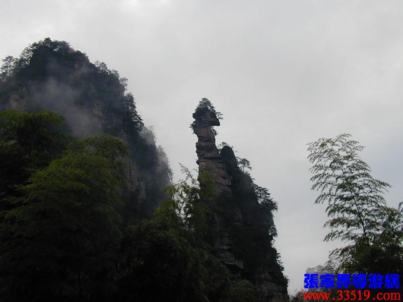 (南天一柱)現(xiàn)在我們前方幽谷峰林中有一高達200多米的孤峰,宛如擎天玉柱。上部灌木點綴,中部巖身赤裸,下部樹木遮掩,峰體渾圓、偉岸,因立南天門下而得名?!?/p>
