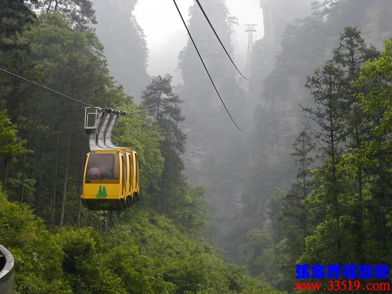 (索道站)現(xiàn)在,我們就要乘索道下山了。黃石寨(黃獅寨)索道是1995年5月至1997年9月臺灣證吉興業(yè)有限公司與張家界公園管理處合資興建的我市第一條觀光索道。索道線路水平距863,高差431米,運行速度每秒8米,單向小時運量948人,設(shè)備全部從法國波馬公司引進,總投資4000多萬人民幣。黃石寨(黃獅寨)索道的建成,為公園開辟了一條空中游覽線,填補了張家界無觀光索道的空白。古詩說:會當(dāng)凌絕頂,一覽眾山小。乘索道觀張家界公園,別是一番感受。