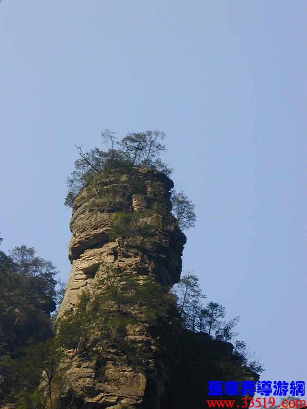 (亂竄坡)左邊這個(gè)坡,相傳向王天子兵敗后主力部隊(duì)從這里撤退上袁家界,進(jìn)天子山。這時(shí),官兵追上來了,埋伏上的士兵一刀砍斷葛藤,滾木擂石潮水般砸了下來,打得官兵四處亂竄,以后就把這個(gè)坡叫“亂竄坡”。從亂竄坡可以上著名風(fēng)景游覽線袁家界,那里有后花園、迷魂臺(tái)、天下第一橋、天懸白練瀑布;還可以取道上天子山、進(jìn)楊家寨。大家抬頭看,就是這座孤峰,叫羊寨,那里是一片原始森林。