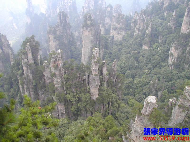 (大觀臺)這就是大觀臺。極目遠(yuǎn)眺,千百座奇峰盡收眼底。一位詩人說,武陵源的砂巖峰林是一步一觀景,千步千造型,一山有四季,十步不同天。專家測算出武陵源石峰有3103座。一如一位高超的雕塑大師,模擬宇宙萬物,無不形狀逼真,維妙維肖,栩栩如生,呼之欲動。有的如海螺出水,有的如金龜銜日,有的如蓮花盛開,有的如天橋橫空,有的如長槍刺天,有的如寶塔聳立,有的如老人采藥,有的如玉女梳妝,有的如將軍出征,有的如戰(zhàn)馬長嘯,有的如情人幽會,有的如夫妻相擁,有的如仙女散花,有的如村姑守望.....有的孤峰獨秀,有的直插云霄,有的婷婷玉立,有的威武勇猛,有的小巧玲瓏,有的大氣磅礴。進入武陵源,但見一片峰的森林,峰的世界,峰的海洋。挺拔、奇秀、集中、原始、粗獷、古野。這就是武陵源。一位藝術(shù)大師說:武陵源的山峰,改寫了山的概念。大攝影家陳勃說:“三山五岳堪比美,華夏風(fēng)光每一流。”王繼杰先生說:“武陵源上三日游,勝讀千篇李杜詩。”許世杰先生說:“秀幽險峻稱奇絕,五岳黃山拜下風(fēng)。”李成瑞先生為此大抱不平:“神州勝景誰為最?須請霞公重評勘。”可惜徐霞客無緣到大觀臺來,也不可能為武陵源作甚評價了。