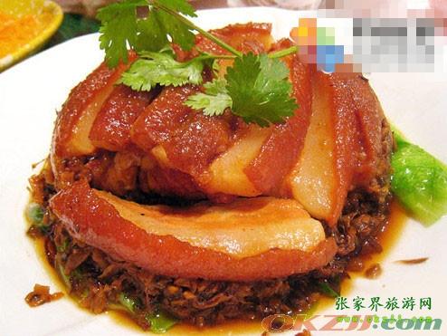 “土家扣肉“是《張家界》土家人待客的一道主菜、和豬肘子齊名。一般只有在當(dāng)?shù)氐娜宿k酒席或大型活動(dòng)的時(shí)候才會(huì)上用作主菜。土家扣肉的做法均采用五花豬肉,經(jīng)過煮、炸、蒸等多道工藝制成,上席時(shí)肉的下面一般都會(huì)用干咸菜(或者豆豉)鋪底。 |