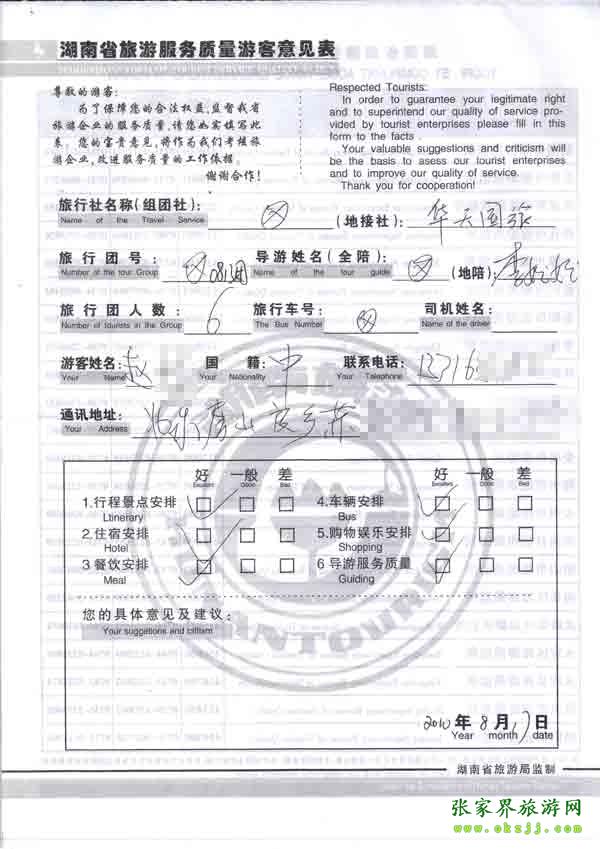 2010年8月17日北京趙先生一行6位旅游質(zhì)量反饋