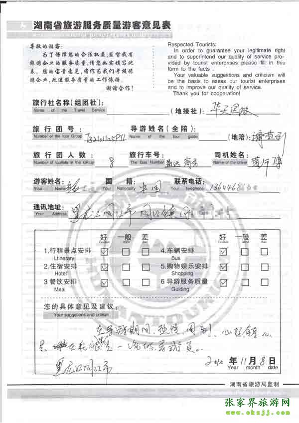 2010年11月8日黑龍江張先生一行8位旅游質(zhì)量反饋:導(dǎo)游熱情周到,有孝心,是一流導(dǎo)游