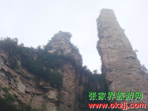 什么?有人說夫妻巖是兩個石頭啦。那旁邊的那個石頭是第三者?我暈,佩服你們的想象力啊。夫妻巖位于黃石寨對面山頭,張家界山莊后,在田家臺的對面,有兩個自然生成的山峰。這山也真奇,一個象男,一個象女,頭挨著頭,身靠著身,有眼睛,有鼻子,有頭發(fā),有嘴唇,就連眉毛與牙齒,也看得清清楚楚,明明白白。他倆站在高山,立在神地,相親相愛,永不分離。相傳,這是花仙山荷花與養(yǎng)蜂人田花郎歷盡千辛萬苦,幾度起死回生結(jié)合而成的,如遇自己的紅顏知己,可以去此處看看,許下心愿可保夫妻和睦,家庭幸福。