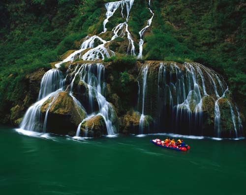 在金鞭溪游覽過程中,可見一組奇峰,有兩座較高的石峰緊密相連,下半截連為一體,上半截一高一矮,高者略欠身,低者稍后仰,好一幅相愛擁抱的絕妙畫面,恰似一對久別重逢的夫妻,故名相會峰,亦稱千里相會。相傳東海龍宮小龍女常來此地觀賞風景,一次偶然的機會,結(jié)識了峨眉山遠道而來的后生,二人情投意合,很快便產(chǎn)生了愛情。龍王知道此事以后,非常惱怒,決意拆散二人,多次將小龍女關在龍宮,但小龍女想方設法逃出來,常常與情人相會。龍王一氣之下,將二人點化成石,便成石峰“千里相會”。 十一、茅巖河漂流